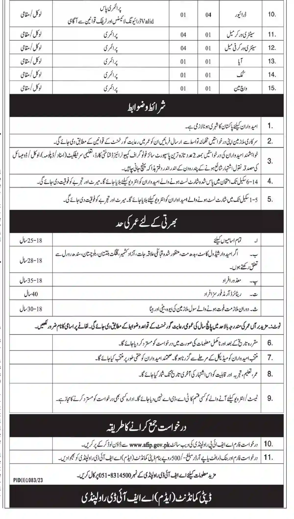 - The candidate has to send the application and attested documents which includes CNIC copy, domicile, Educational documents, two passport size photographs and five hundred rupees bank draft (Rs 500) to the following address Deputy Commandant (Admin), AFID, Rawalpindi.
