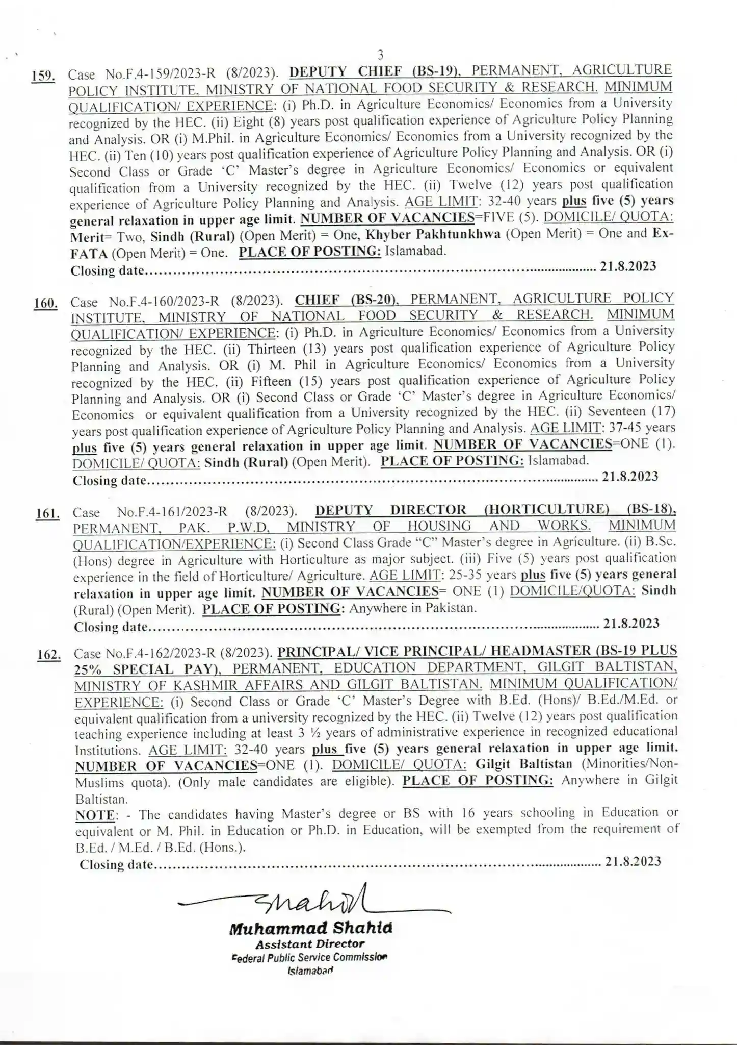 - Principal/ Vice Principal/ Headmaster (BS-19)