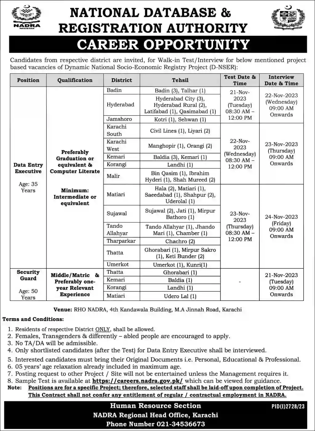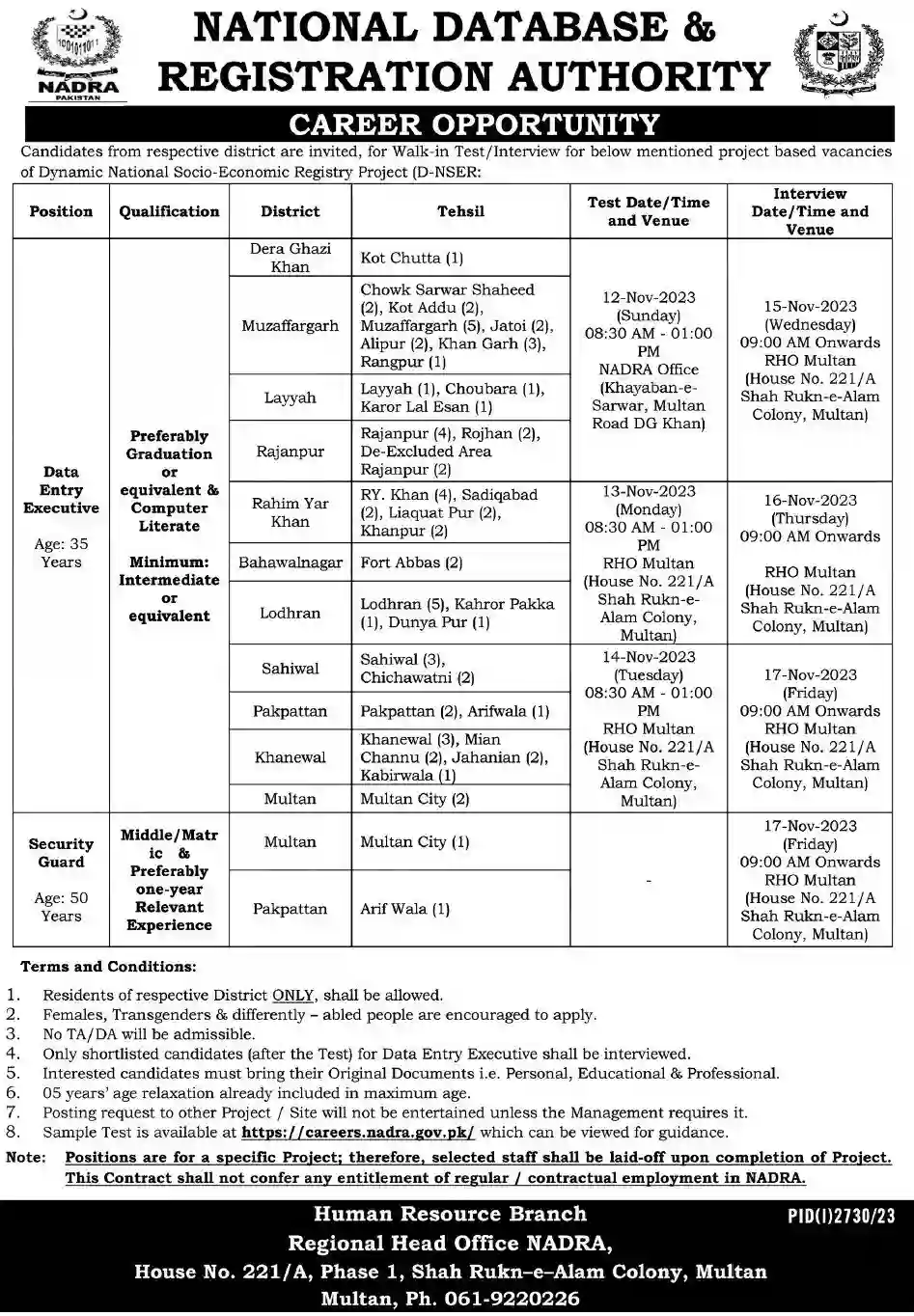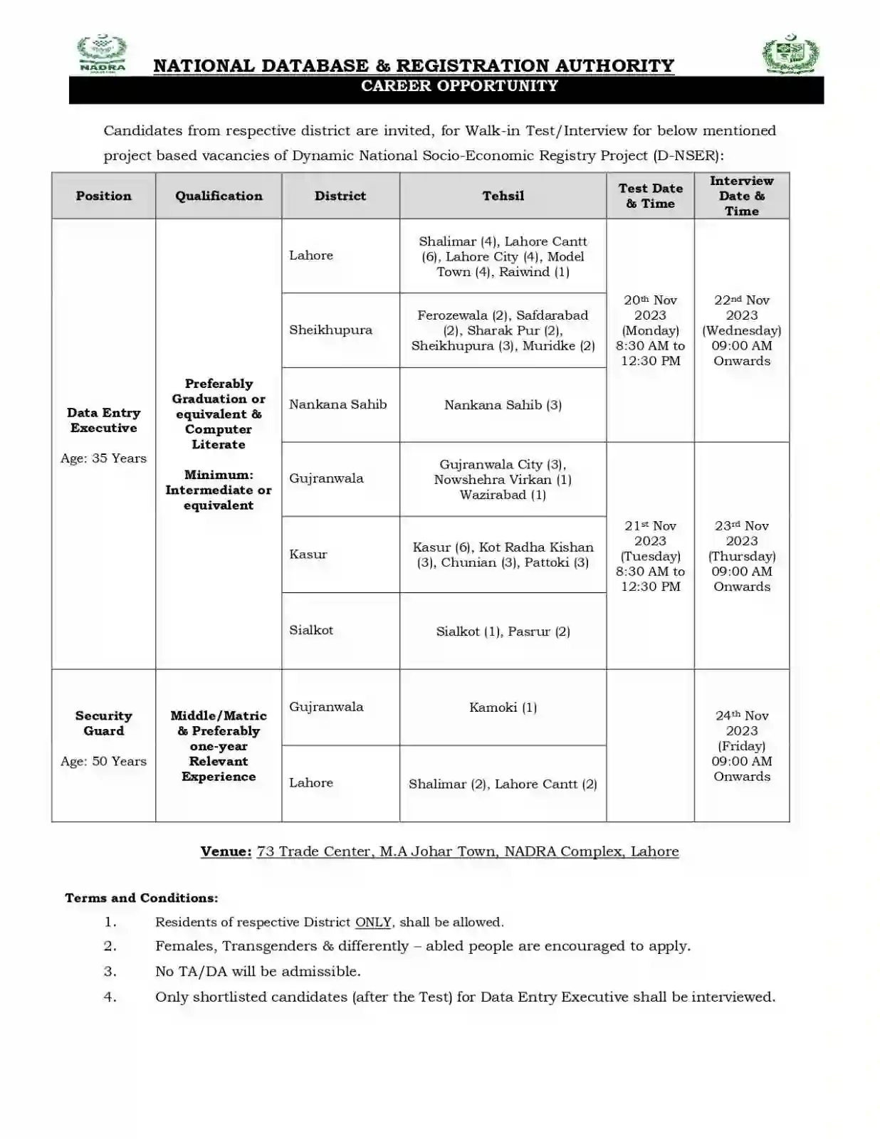 The applicants from respective district are invited, for Walk in Test/Interview for below mentioned project based vacancies of Dynamic National Socio-Economic Registry Project (D-NSER). Age Relaxation will be given as Per Government Rules for 5 years. Only short listed candidates will be called for test and interviews. No TA/DA will be paid for appearing in Test/Interview. Females and Transgenders and differently abled individuals are highly encouraged to apply. Residents of respective districts are only allowed.