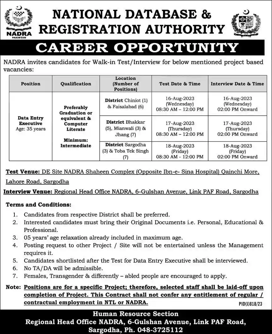 5 years age relaxation is already included in the maximum age limit. Candidates shortlisted after test for Data Entry Executive shall be interviewed. No TA/DA will be admissible for tests and interviews. Females, Transgenders, and differently-abled persons are encouraged to apply. Positions are for specific project. NADRA career opportunity jobs are good option for the candidate.
