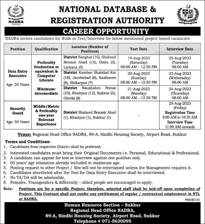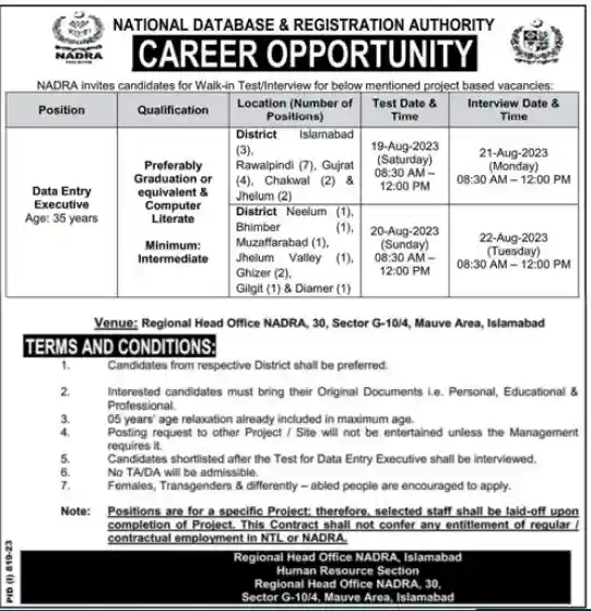 NADRA Jobs August 2023 Apply Now. The job advertisement is published on 6th August 2023. NADRA invites candidates for Walk in Test and Interview for below mentioned project based vacancies. These government jobs are good opportunity for candidates. The candidates from respective districts will be preferred