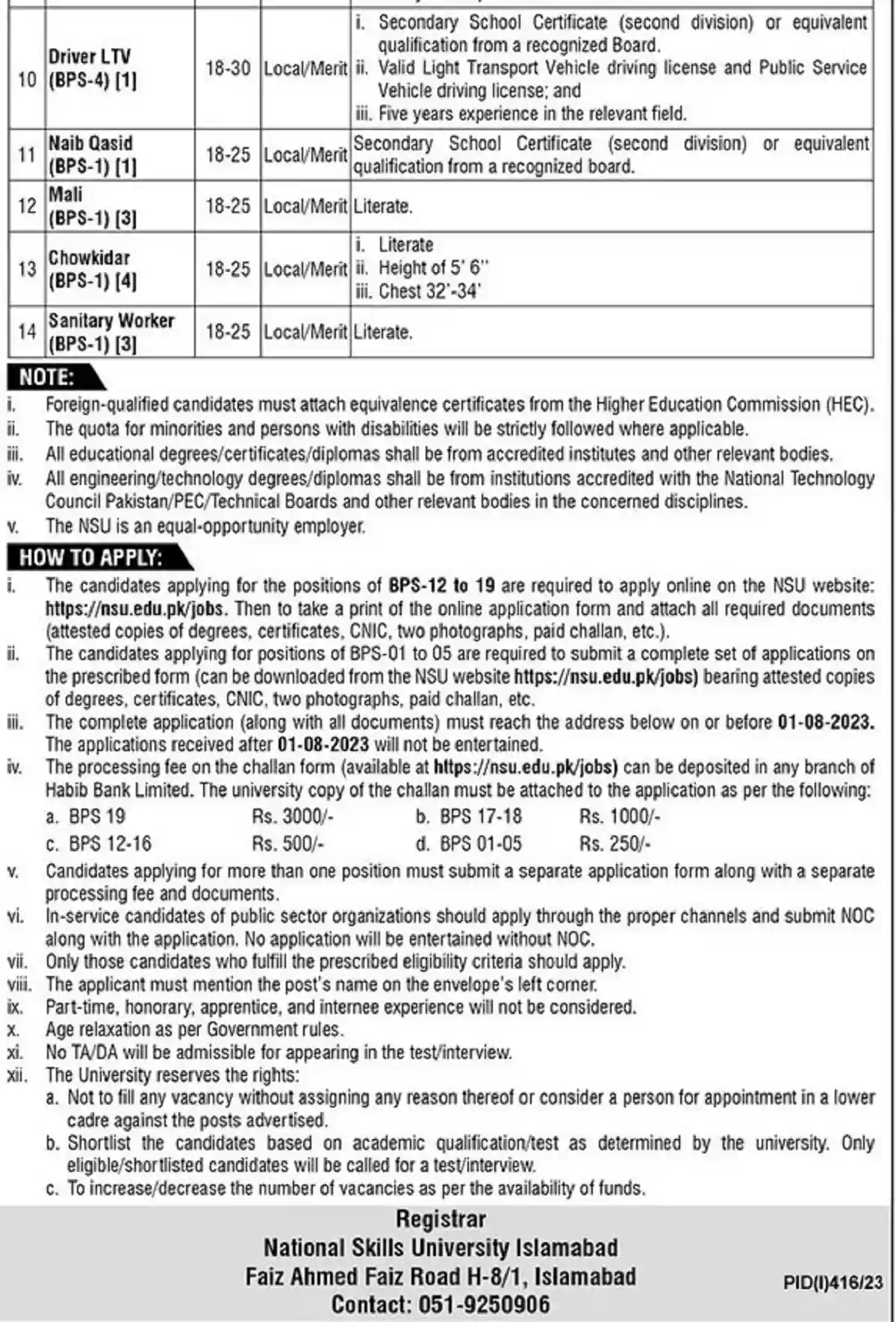 The jobs will be on contract basis for a period of one year. The contract will be renewable on the basis of satisfactory performance. Both teaching and on teaching positions are offered. The required qualification is PhD, Masters, Bachelors, Diploma, Intermediate, Secondary School Certificate and literate. The age relaxation is admissible as per government rules. No TA/DA will be admissible. Person in government service should apply through proper channel and submit NOC along with the application. The domicile is of Punjab and Local Merit. NSU is an equal opportunity employer. The candidate should have HEC recognized degree.