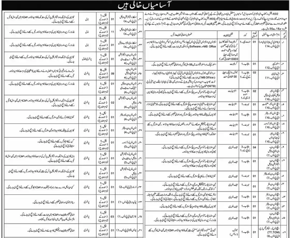 - All Applications except (BPS-01 to BPS-04) must contain a Postal Order of rupees 500 in favor of Commandant 602 Regional Workshop EME Karachi.
